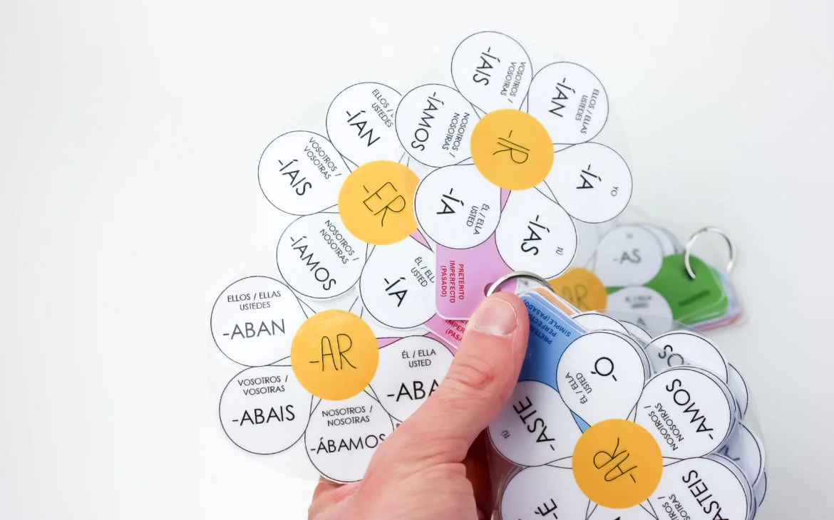 En el PDF que tenéis disponible para descargar al final de la entrada vais a encontrar 11 flores diferentes con las terminaciones para conjugar verbos regulares en español.