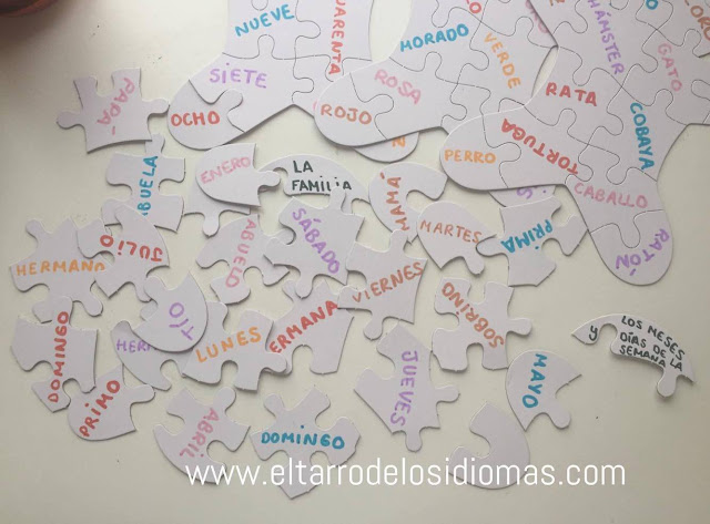 En el sobre vienen 5 plantillas de puzzles y se me ocurrió hacer un juego para repasar todo el vocabulario que hemos visto durante estos meses de curso. Para ello en la cabeza del muñeco escribí en negro el tema «Animales», «Días de la semana», «Familia»…etc. Y con rotuladores de colores escribí las diferentes palabras relacionadas con el tema. (os dejo una foto que seguro que es más fácil de entender) La idea es mezclar más de un puzzle para que la actividad tenga sentido. En mi caso les voy a dar los 5 muñecos para que clasifiquen las palabras.