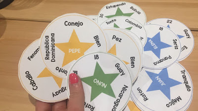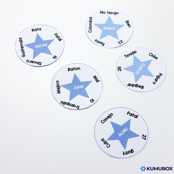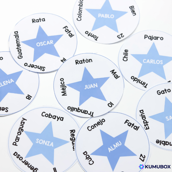 En esta ocasión el material son estas estrellas charlatanas. El concepto es muy sencillo. Simplemente se reparten las estrellas entre los alumnos y tendrán que ir andando por la clase preguntando. ¿Cómo te llamas? ¿Cuántos años tienes? ¿Qué tal?. Cada alumno responderá dependiendo de las palabras que tenga en su estrella. Es una actividad muy sencilla pero «obliga» a levantarse de la mesa y a interactuar en una segunda lengua.