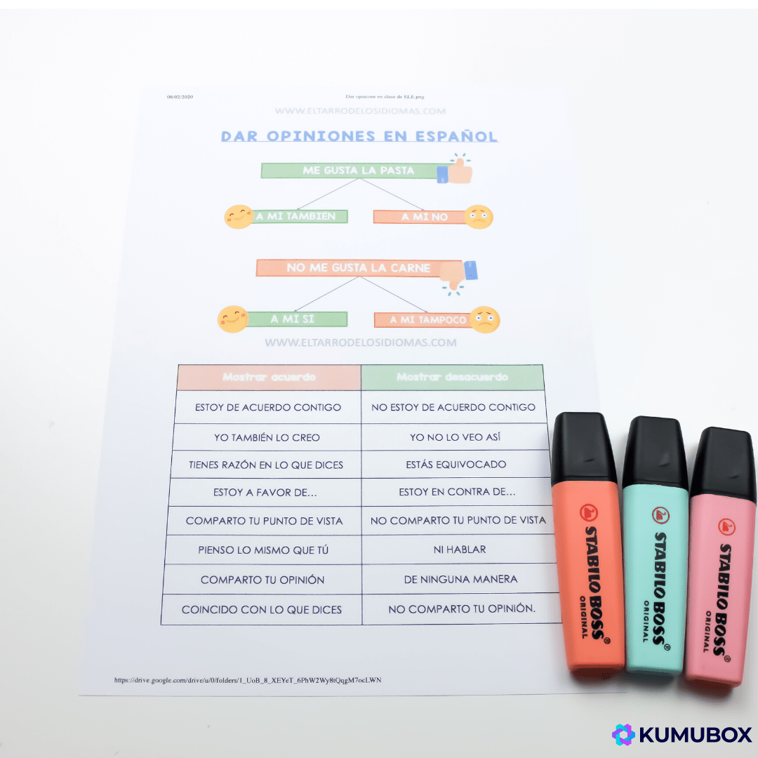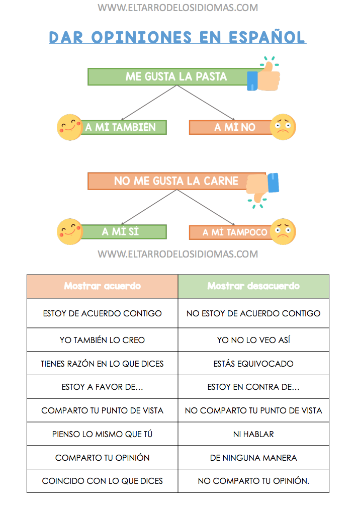 Se trata de una ficha muy sencilla, personalmente voy a imprimir dos por cada hoja A4 y la pegarán al final del cuaderno a modo de referencia cada vez que tengan que hacer algún ejercicio de opinión o escribir un diálogo.